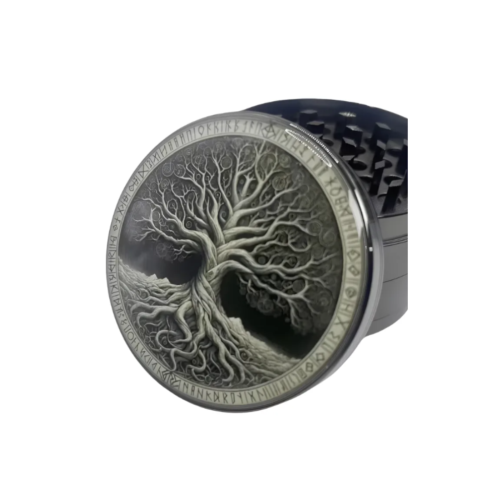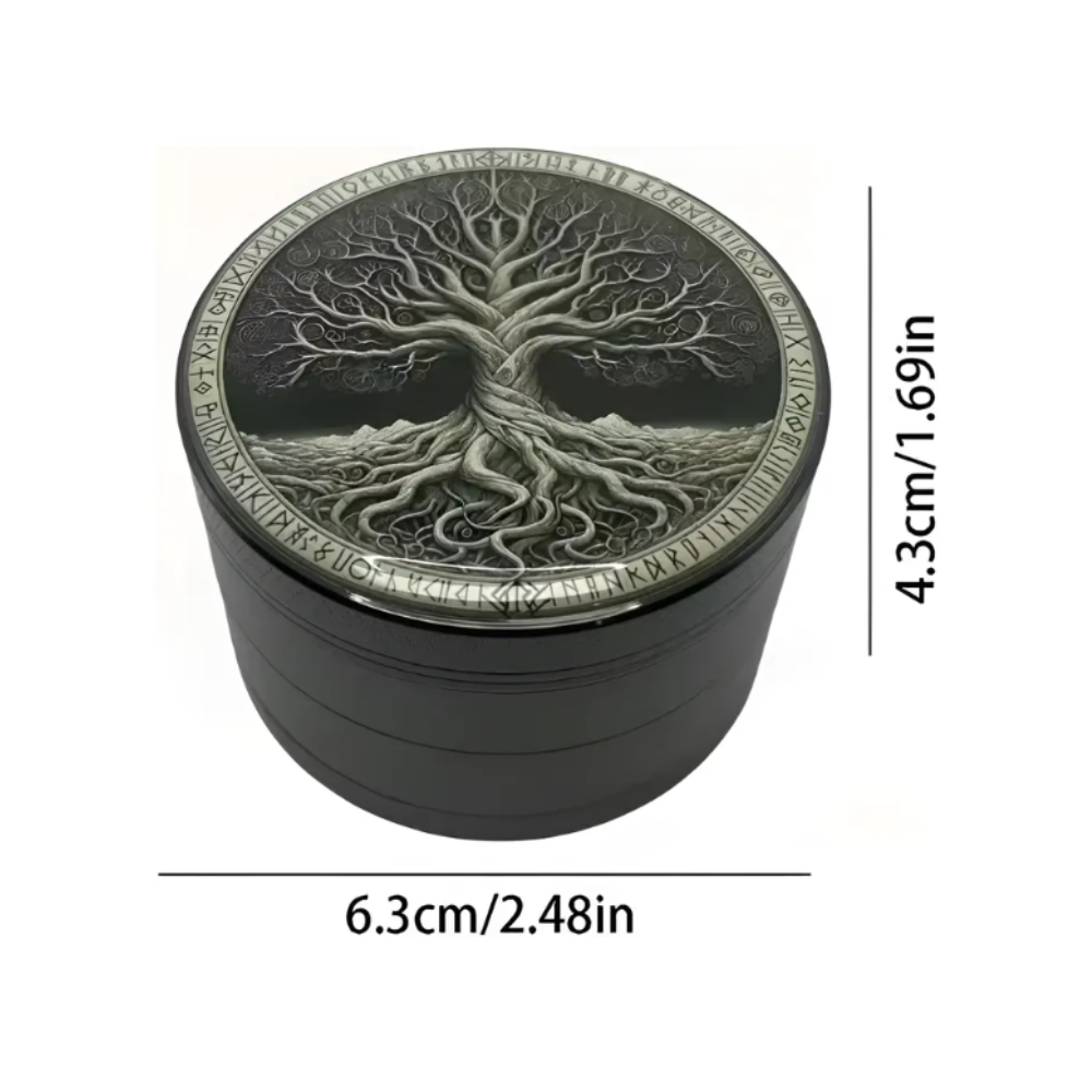 Produzido em liga de alumínio de alta resistência, o dichavador possui 4 compartimentos funcionais, incluindo câmara de moagem, peneira coletora e reservatório de armazenamento. Seu design exclusivo com a gravura da Árvore da Vida traz um toque de elegância e personalidade para o seu kit.