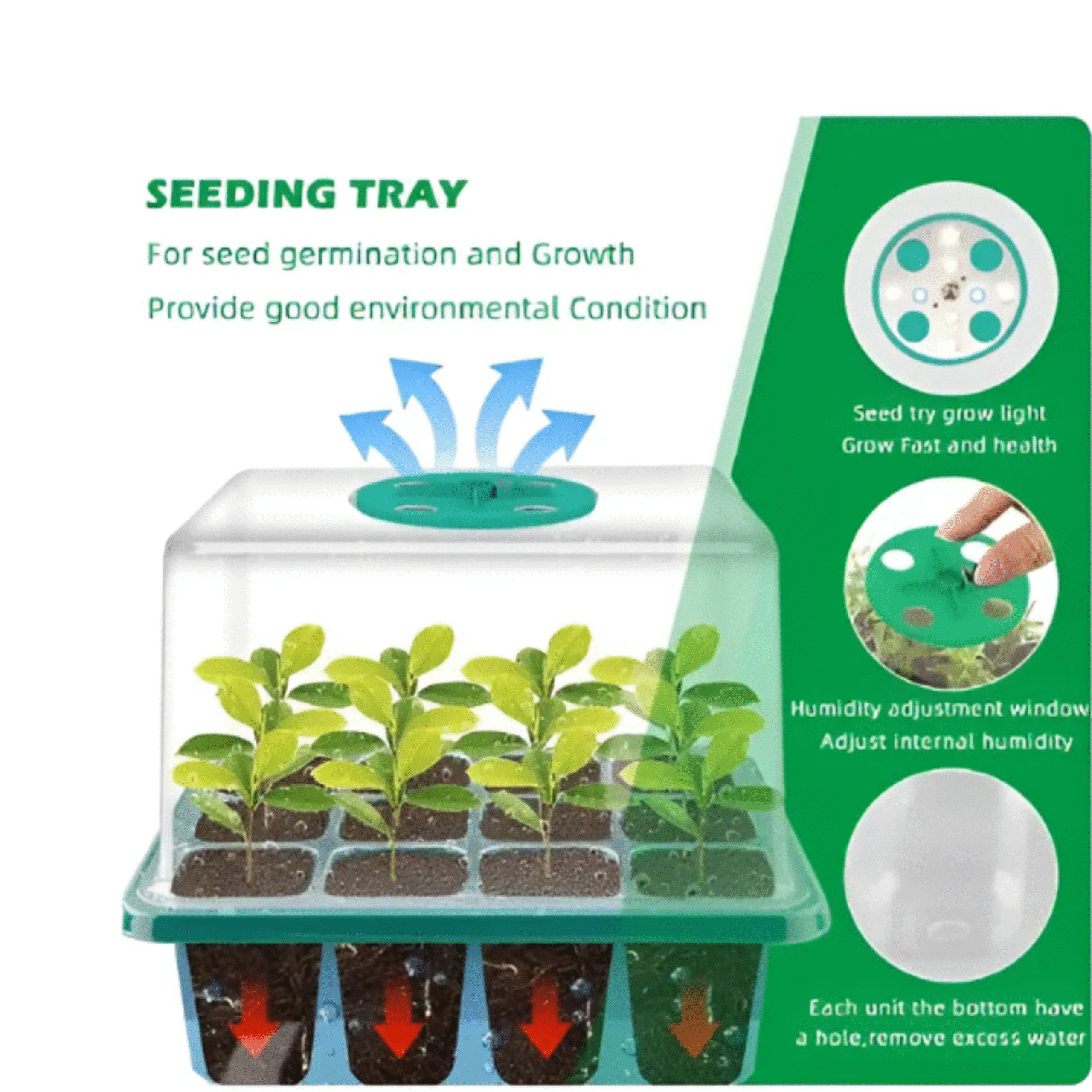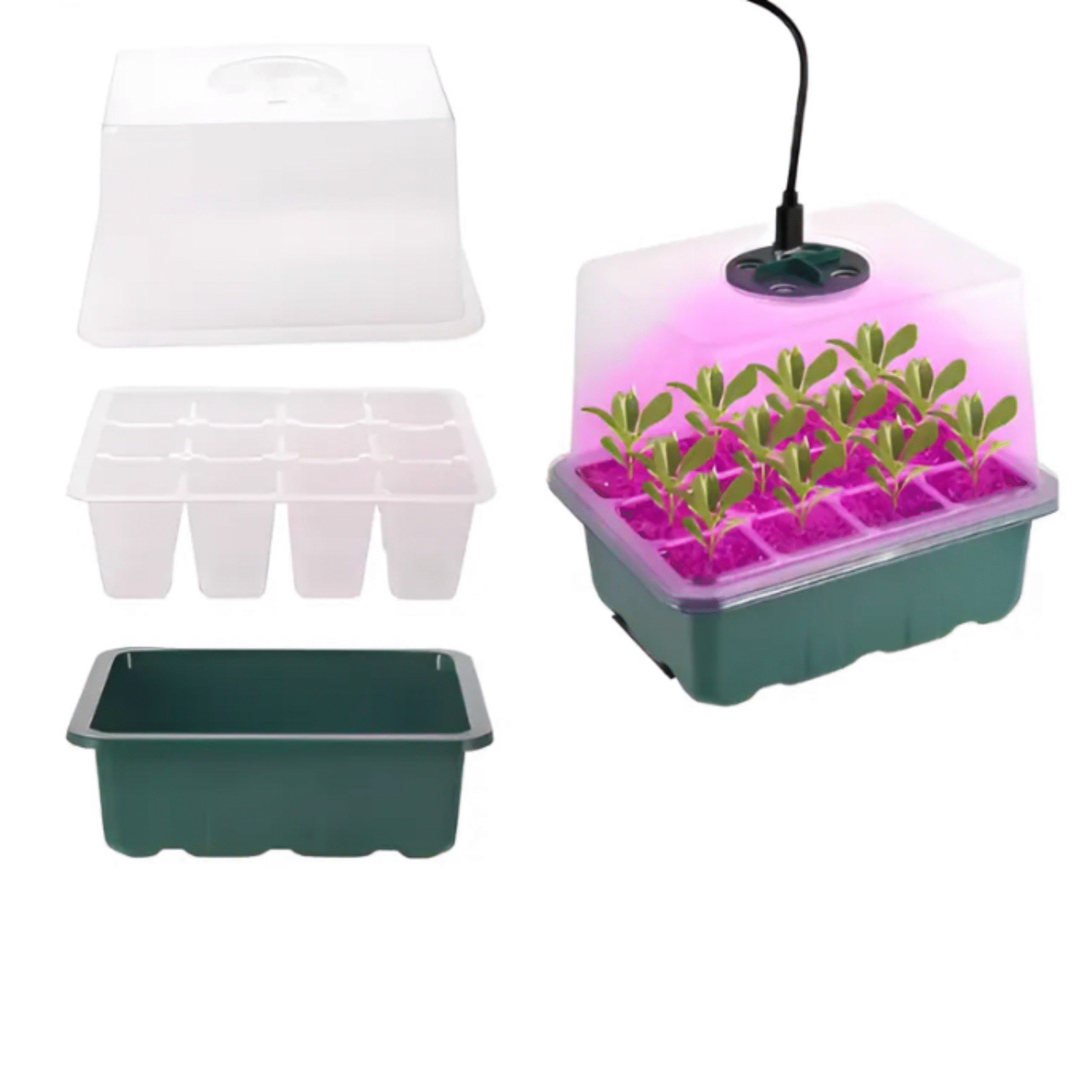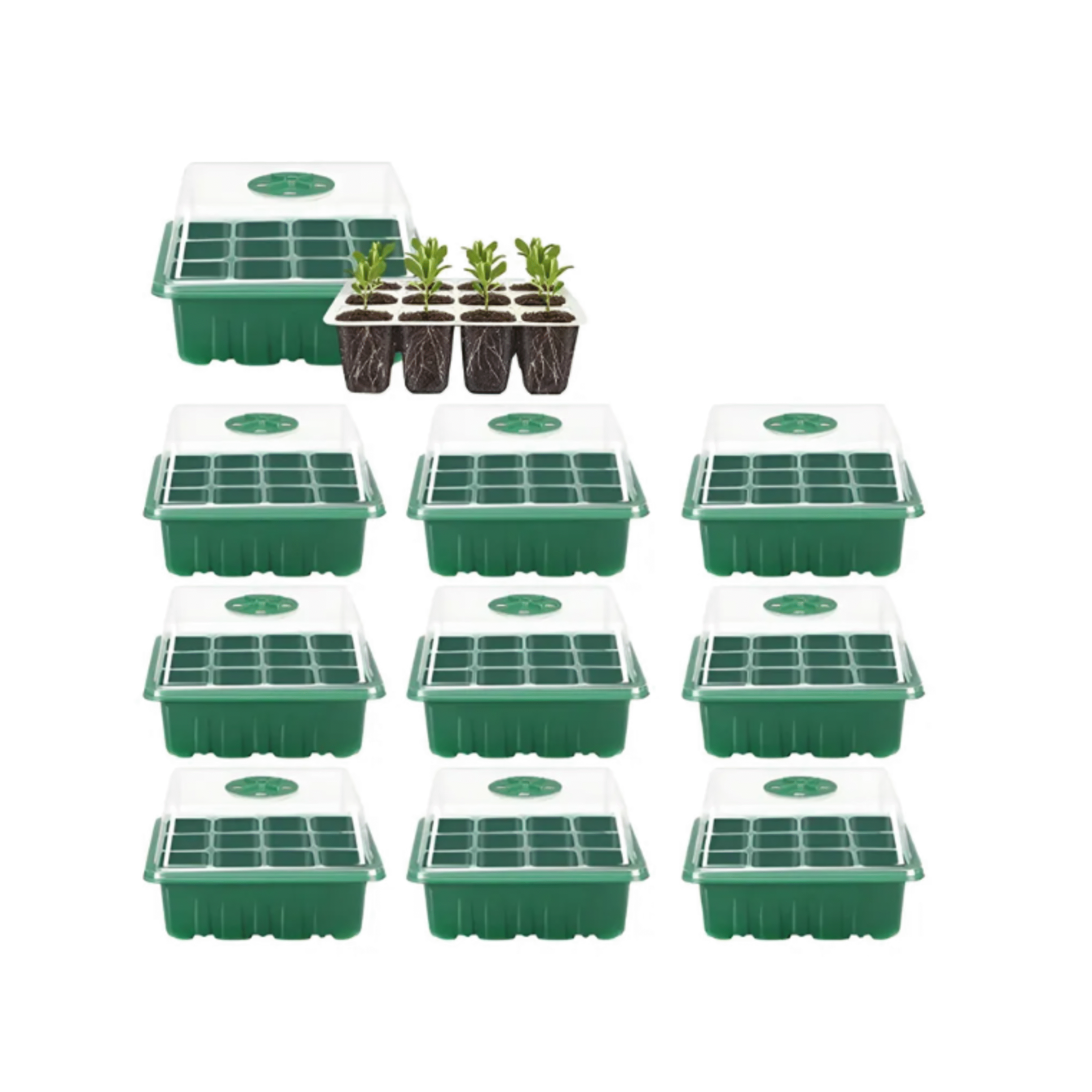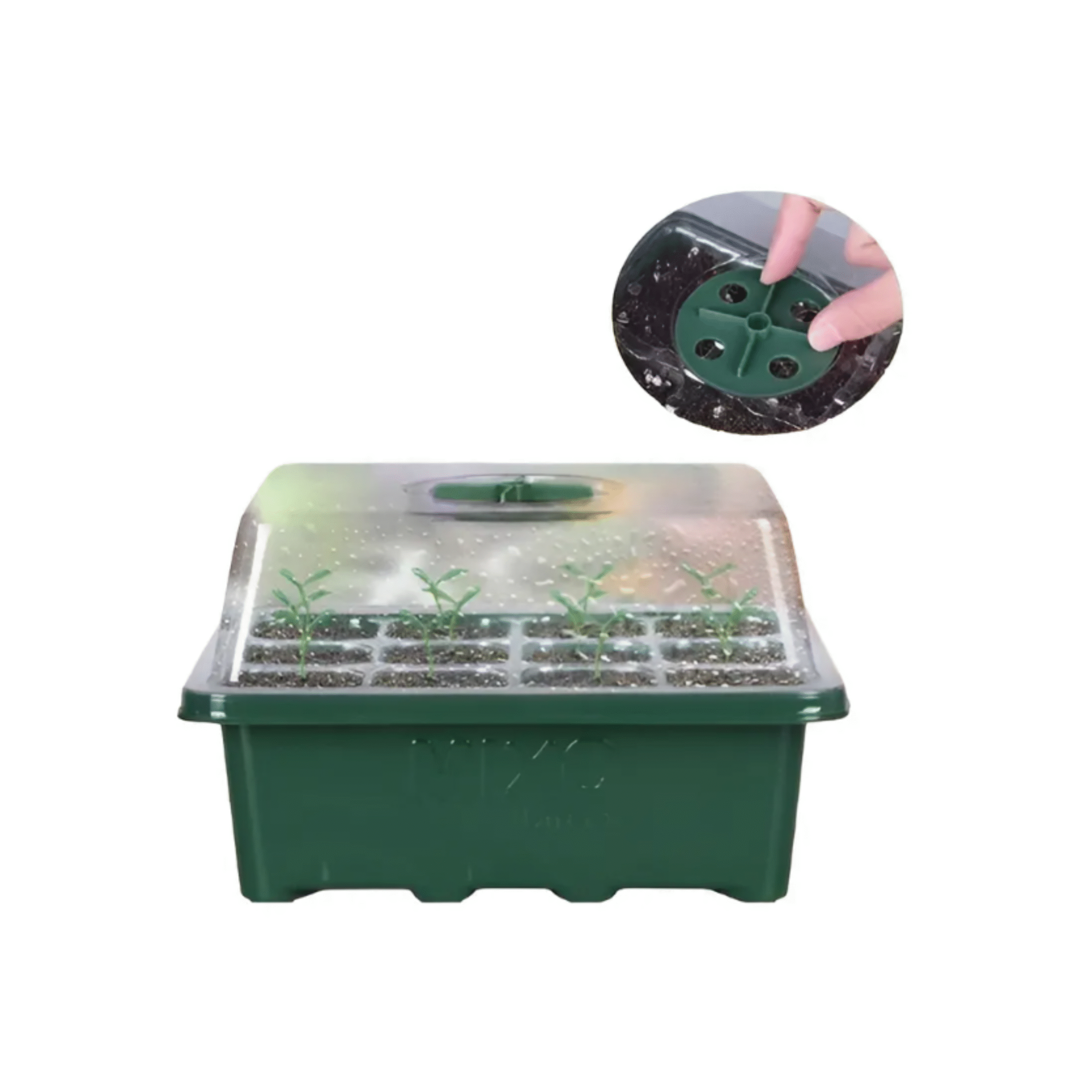 Com uma cúpula transparente de alta resistência, a estufa mantém o microclima ideal para o desenvolvimento inicial das plantas. Seus 12 compartimentos individuais permitem organizar diferentes espécies ou lotes de sementes de maneira prática e higiênica, evitando contaminações e otimizando o espaço.