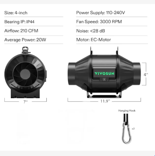Ventilação Eficiente: O AeroZesh T4 oferece um desempenho poderoso com um fluxo de ar de 210 CFM para criar ventilação ideal em seu espaço de cultivo; Um ventilador EC controlado por PWM com design de fluxo misto totalmente ajustável e responsivo ao ambiente.