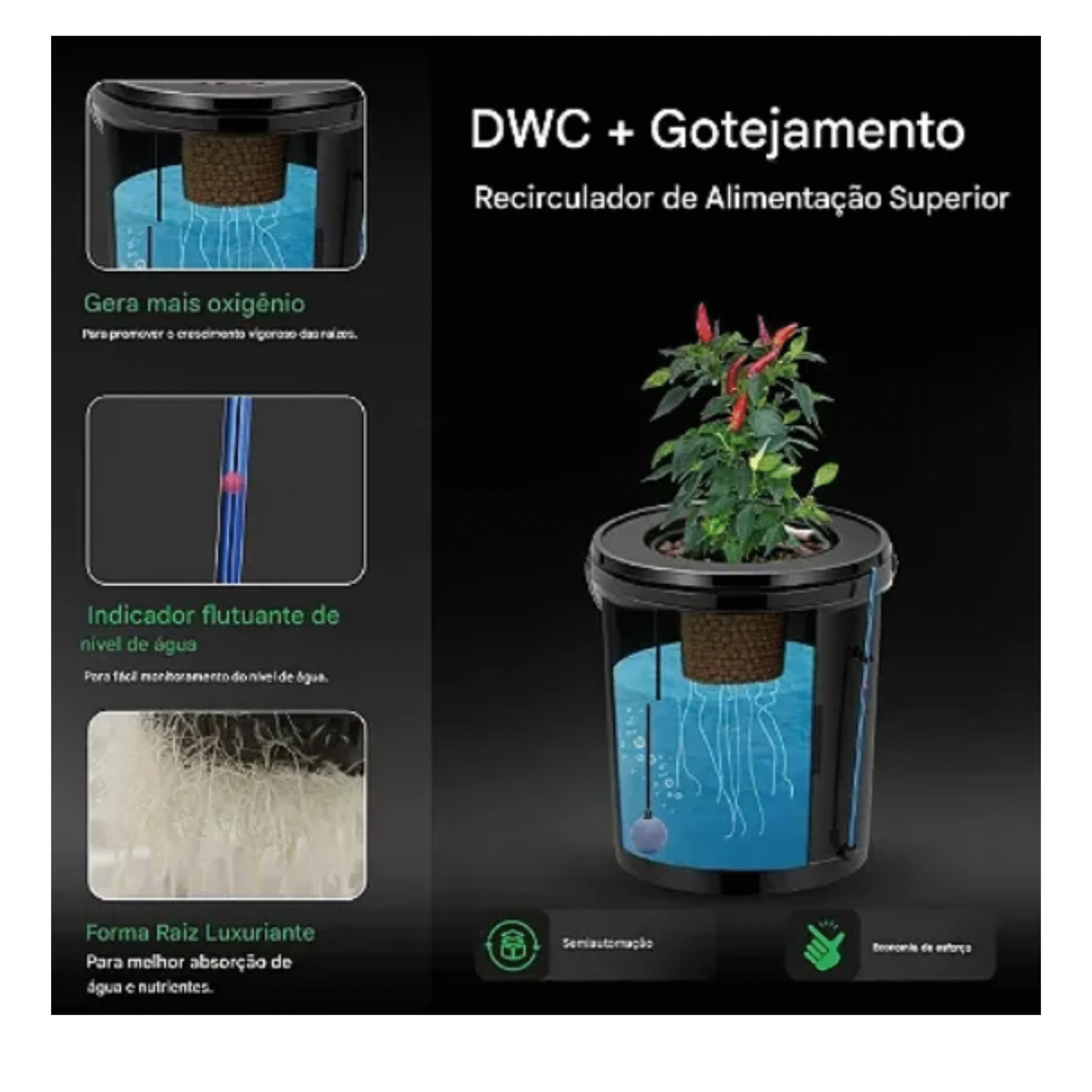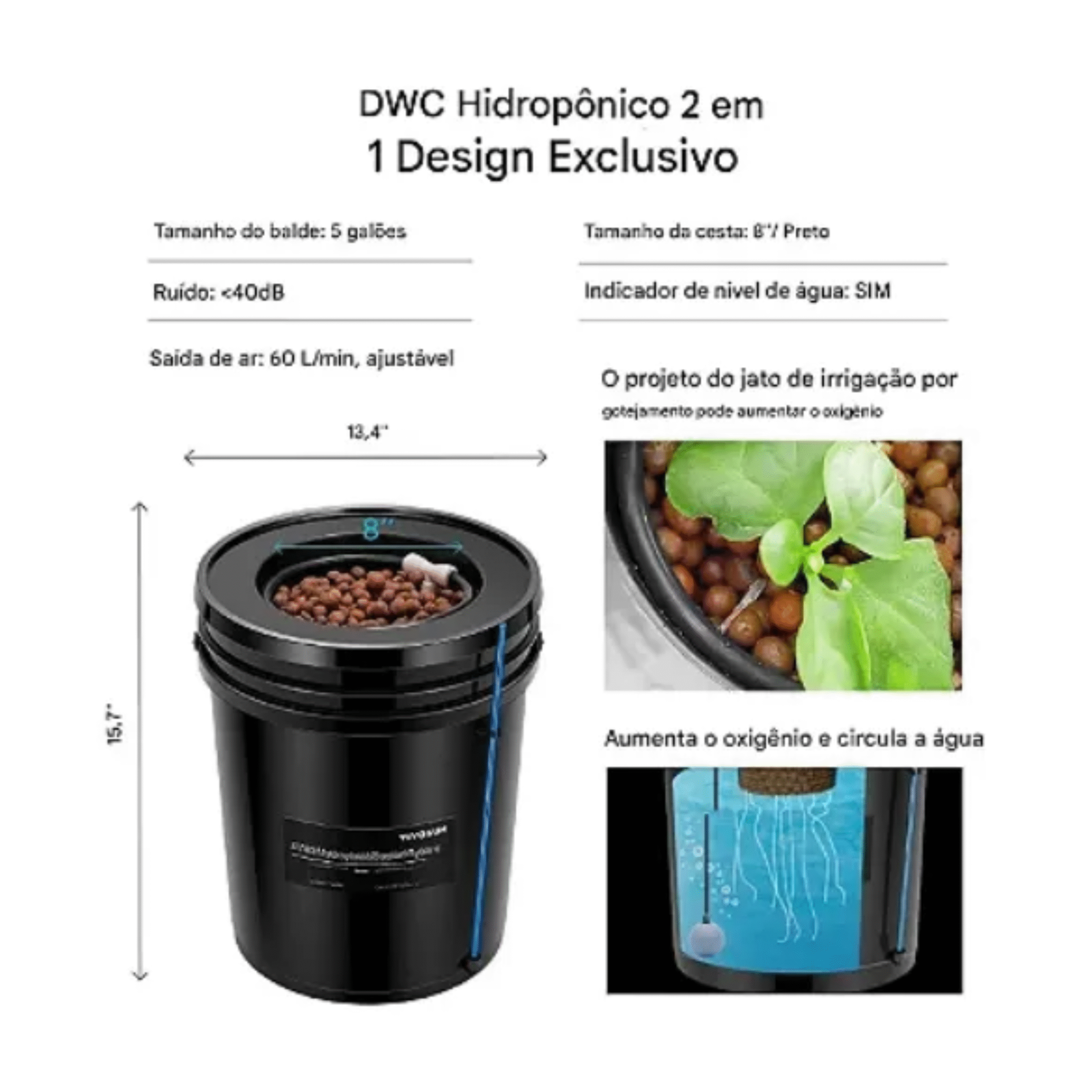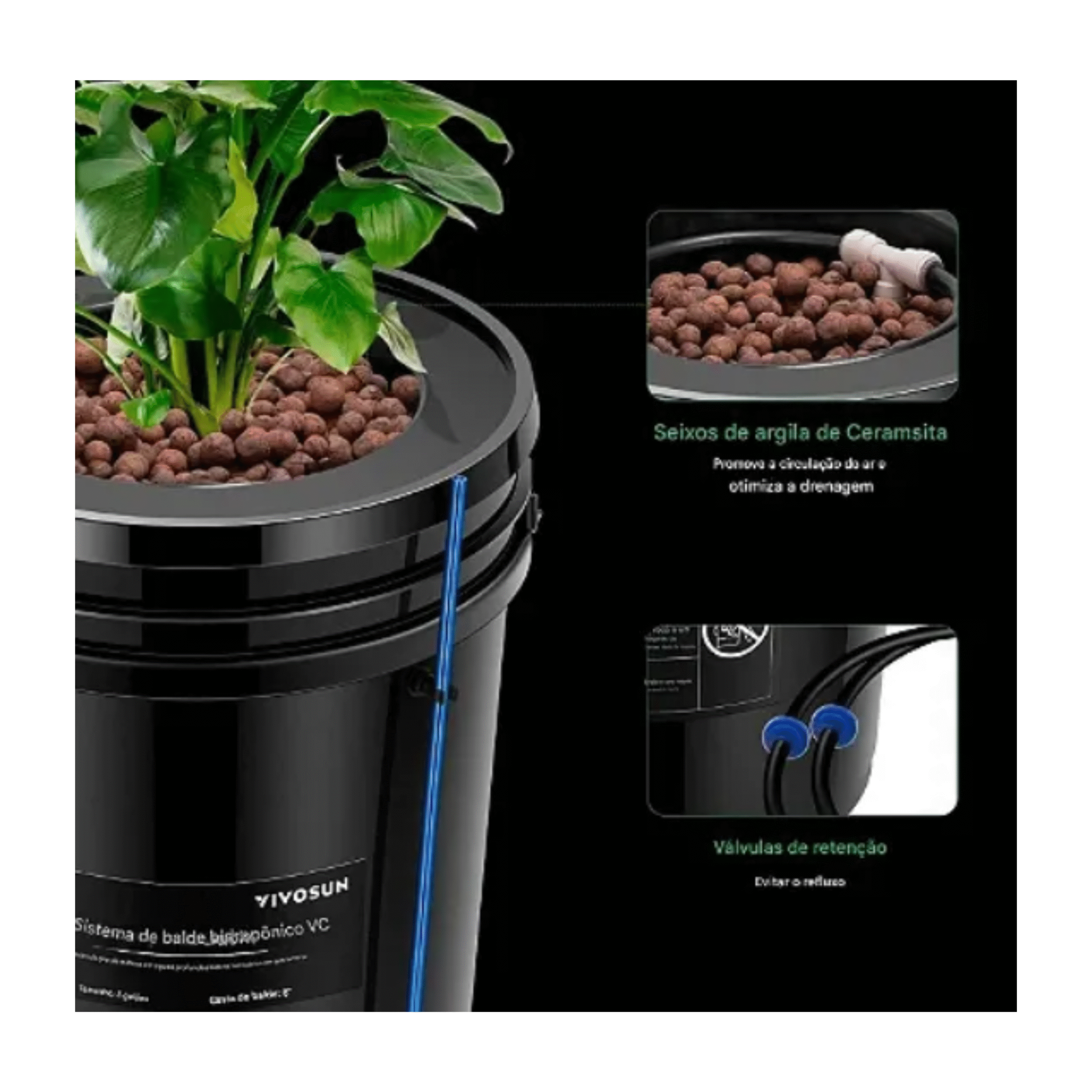 O Sistema Hidropônico VIVOSUN DWC 5 Galões com 4 Baldes é uma solução completa, moderna e altamente eficiente para cultivo indoor. O sistema combina a tecnologia Deep Water Culture (DWC) com irrigação superior recirculante, proporcionando oxigenação constante das raízes, distribuição uniforme de nutrientes e crescimento acelerado das plantas.