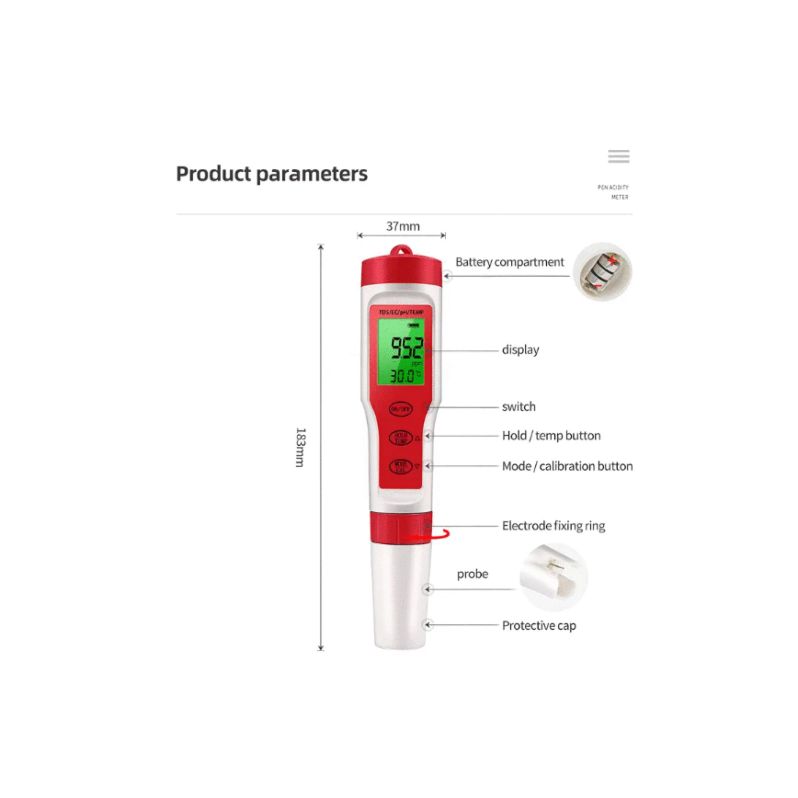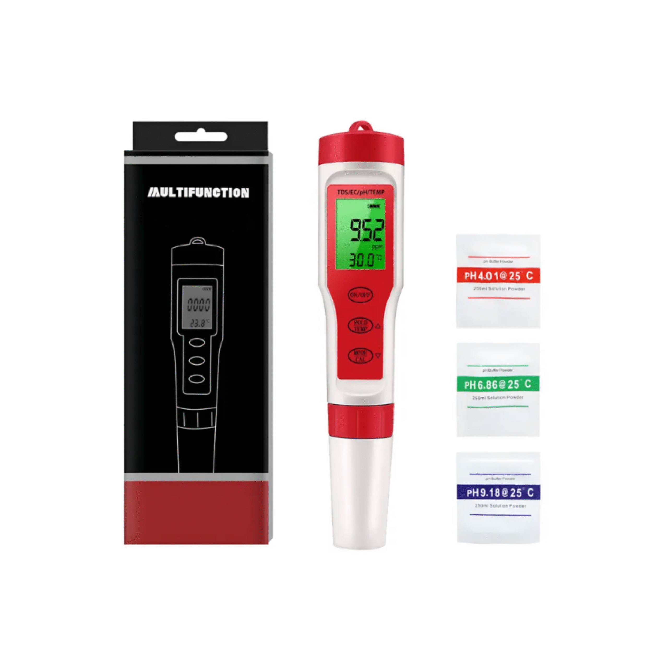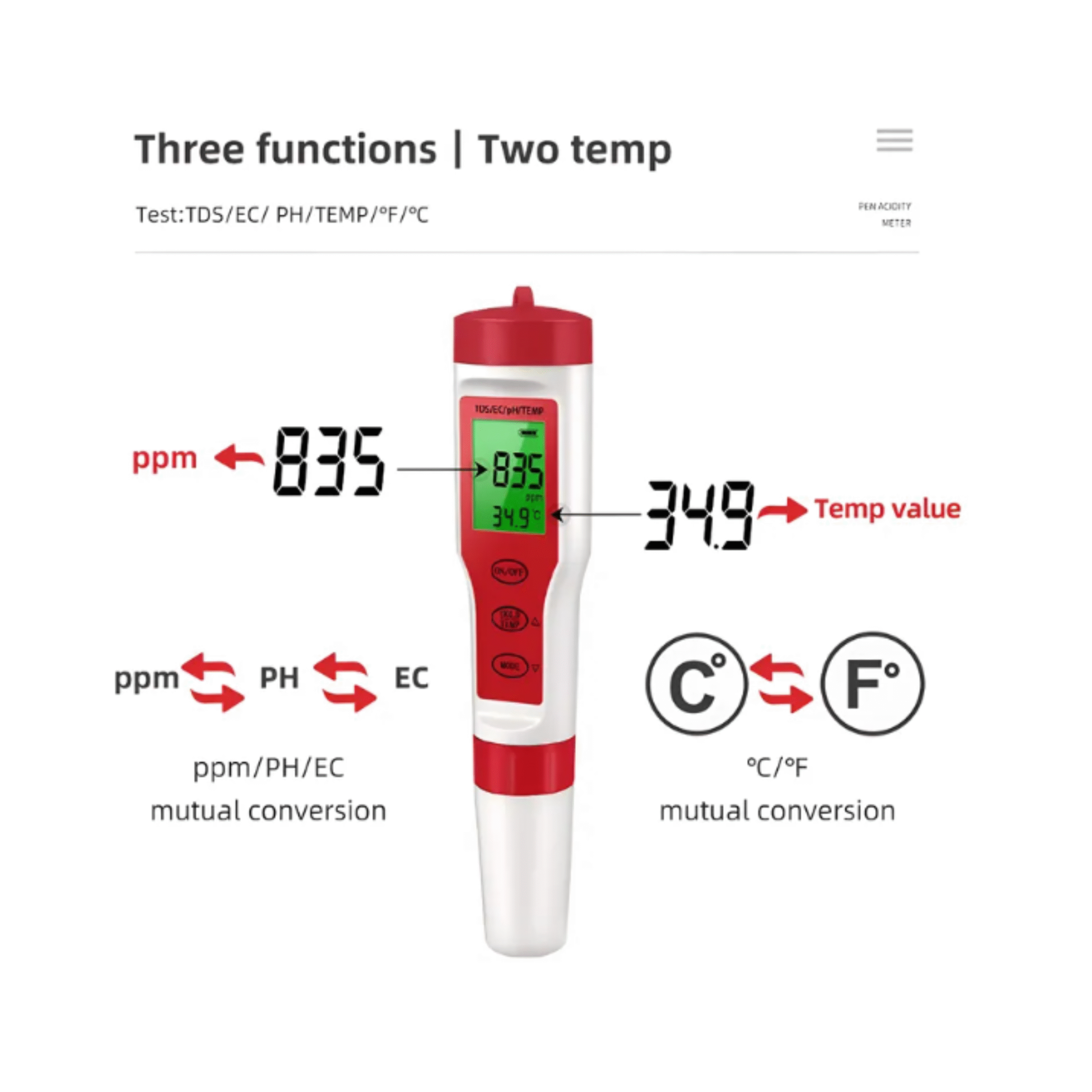 Monitore a qualidade da água com eficiência e precisão usando o Medidor 4 em 1, ideal para hidroponia, aquários, piscinas, laboratórios, spas e uso doméstico. Equipado com sonda de titânio e Compensação Automática de Temperatura (ATC), garante medições estáveis mesmo em diferentes condições.