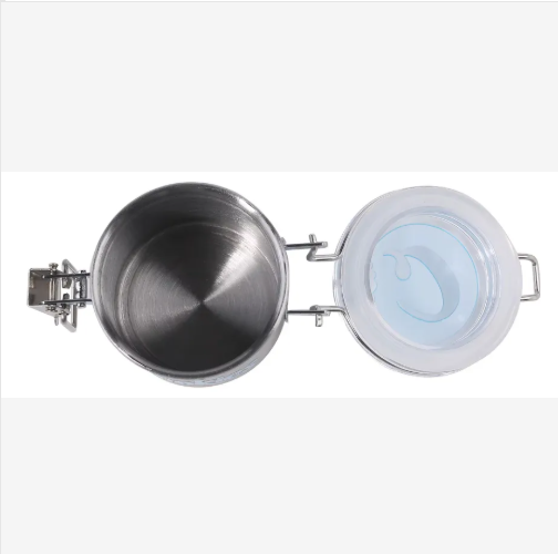 Possui tampa transparente, anel de vedação em silicone e trava metálica de pressão, garantindo um fechamento firme que reduz a entrada de ar e ajuda a conter odores, mantendo o conteúdo fresco por mais tempo.