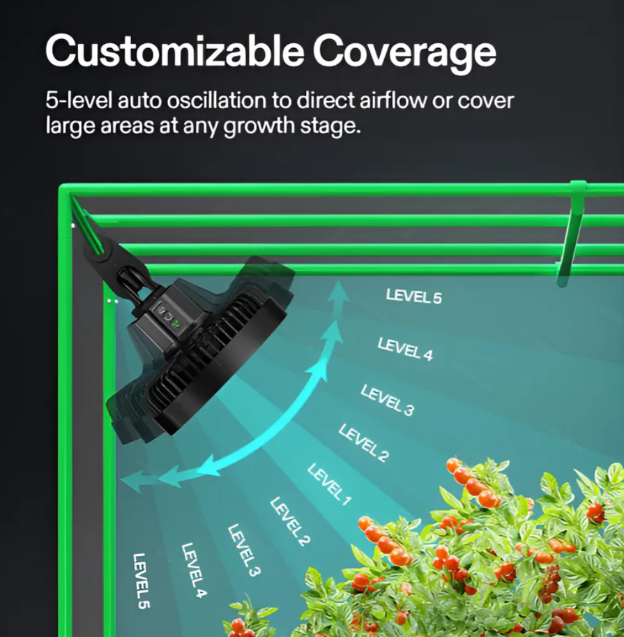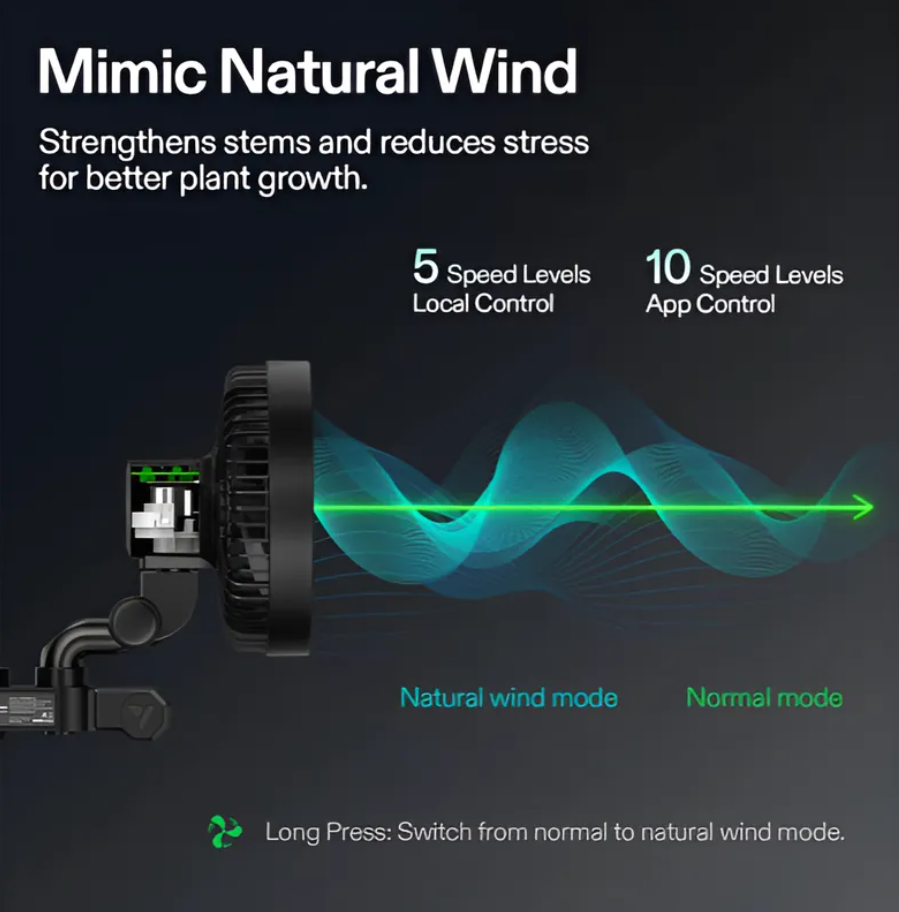 O ventilador conta com controle inteligente via Wi-Fi, compatível com os controladores VIVOSUN GrowHub E25 e E42A, permitindo ajustar a velocidade e temporização de forma prática e remota.