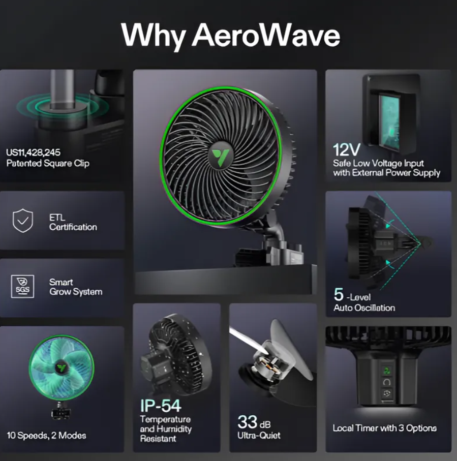 Equipado com motor EC de alta eficiência, o AeroWave E6 oferece baixo ruído (33 dB) e fluxo de ar potente, otimizando o crescimento das plantas sem causar estresse.